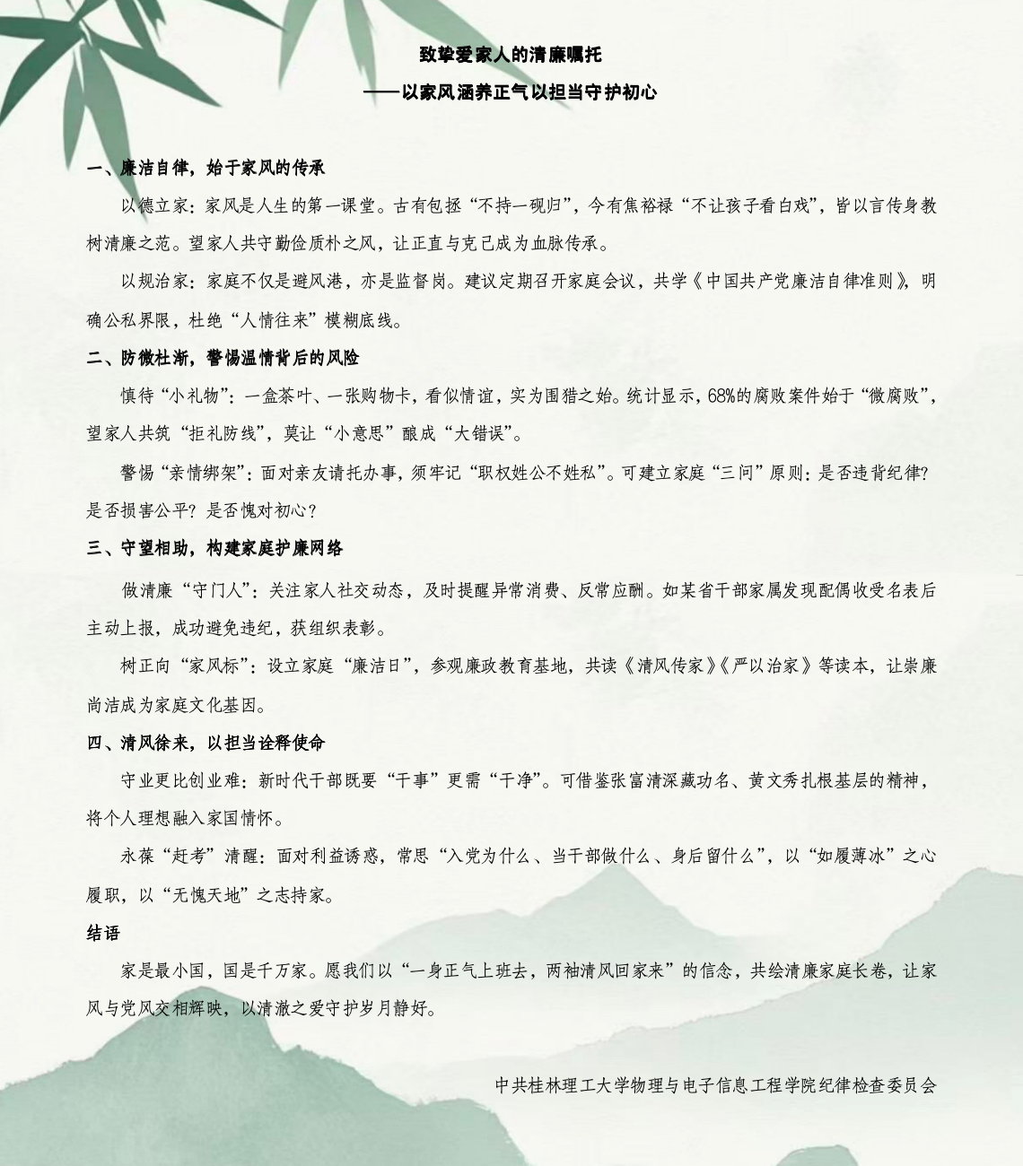 为扎实推进党风廉政建设,筑牢家庭廉洁防线,12月8日,永利集团3044am纪委组织领导干部家属及党员家属前往学校廉政文化园开展主题教育活动。 学院纪委书记蒋琼带领家属们依次参观了廉政文化园的多个主题展区,通过丰富的图文史料、典型案例和互动展示,深入了解党的纪律建设历程与廉洁文化传统。活动特别设置了“廉洁家书”展示环节。现场发放了《致挚爱家人的清廉嘱托》的廉洁家书。家书中强调“以德立家、以规治家”,倡导勤俭质朴、克己正直的家风传承;提醒家属“防微杜渐”,警惕“小礼物”“亲情绑架”等潜在风险;鼓励家庭成员相互监督,当好清廉“守门人”,共同构建家庭护廉网络,并以“一身正气上班去,两袖清风回家来”共勉,凝聚廉洁齐家的共识与力量。 学院纪委书记蒋琼在总结中强调,家庭是反腐倡廉的重要阵地,希望家属们常吹“廉洁风”,当好“廉内助”,共同营造崇廉尚洁的家庭氛围,以良好家风助力学院风清气正政治生态的巩固与发展。此次活动通过沉浸式教育与亲情化倡导相结合的形式,进一步增强了党员干部及其家属的纪律意识与廉洁观念。 现场图片(一) 现场图片(二) 廉洁家书 (一审:夏琳,二审:蒋琼,三审:秦勤忠)